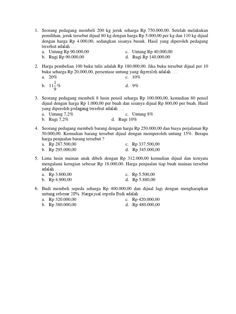 Contoh soal, matematika dasar, rumus matematika sd, sd edit · contoh soal . Berikut ini merupakan soal dan pembahasan mengenai aritmetika sosial yang dianjurkan untuk dipelajari oleh siswa tingkat smp/sederajat, . Seorang pedagang buah membeli satu karung mangga . Ajar hitung kini hadi di youtube, silahkan belajar materi ini di link . Soal di bawah ini merupakan soal kombinasi yang melibatkan berbagai pemahaman yaitu brutto, tara, netto, harga pembelian, harga penjualan dan untung rugi.