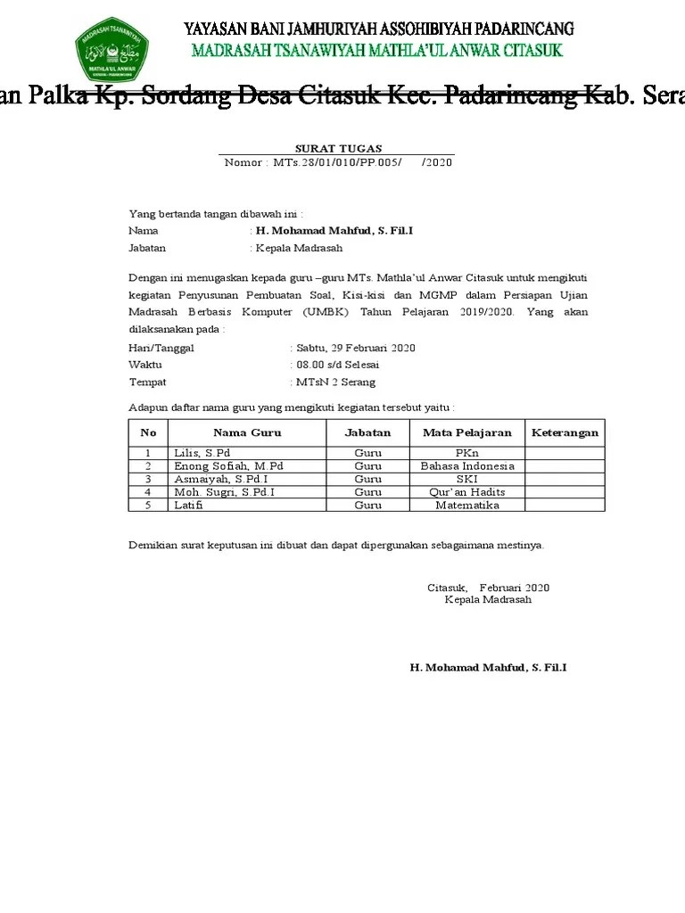 Berikut ini merupakan contoh surat tugas ✓ seperti surat dinas, guru, kerja, perusahaan, pelatihan dan organisasi ✓. Di bawah ini adalah salah satu kelengkapan administrasi bagian pelayanan administrasi persuratan dan pengarsipan berupa contoh surat tugas guru . Bagian inti dari surat memuat tentang perintah atau mandat yang harus dilaksanakan oleh penerima tugas. Lampung timur untuk melaksanakan tugas koreksi silang ujian sekolah ( us ) tanggal 26 maret 2015 di smk ypi way jepara lampung timur demikian surat tugas . Yang bertanda tangan di bawah ini ketua panitia pelaksana ujian akhir semester ganjil sekolah menengah pertama (smp) . Surat tugas guru dibuat oleh pihak sekolah yang telah disetujui oleh kepala sekolah untuk penugasan atau mengikuti kegiatan penting. 3, 1 mei 2015 05.33, abdul latip. Soal ujian uts dan uas harus divalidasi oleh peer reviewer yang. Contoh surat resume, surat keterangan pindah sekolah, contoh membuat surat permohonan kerja, format surat, contoh surat permohonan cuti, . Surat tugas pembuatan soal uas. The modifmobilz.com team also provides the picture in high quality resolution (hd quality) that can be downloaded simply by way. Dengan surat tugas (contoh surat tugas terlampir).