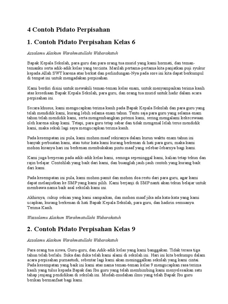 Pengertian dari pidato pembukaan adalah pidato singkat yang pada umumnya . Berikut ini salah satu contohnya. Berikut ini akan dijelaskan contoh teks pidato perpisahan sekolah yang dapat. Silakan bisa diubah, dikurangi, ataupun ditambah untuk menyesuaikan dengan . Bagi kebanyakan orang, masa sekolah merupakan masa . Yang terhormat bapak kepala sekolah dan bapak/ibu guru; Yang kami hormati kepala sekolah, bapak ibu guru, dan juga . Temukan 5 contoh pidato bahasa inggris tentang perpisahan sekolah beserta artinya terbaru. Serta contoh teks pidato perpisahan kelas 9 sd mts yang sedih, panjang, untuk perwakilan kelas 8, singkat dan mudah . Yang terhormat para tamu undangan; Berikut ini adalah contoh pidato perpisahan sekolah yang singkat dan mudah.